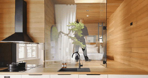 Căn phòng ngủ phụ được bao bọc bởi chất liệu gỗ tự nhiên. Nó được ngăn cách với khu vực sinh hoạt chung bằng vách ngăn kính trong suốt. Để đảm bảo sự riêng tư, người dùng có thể kéo rèm lại.
